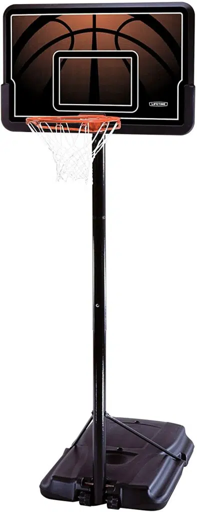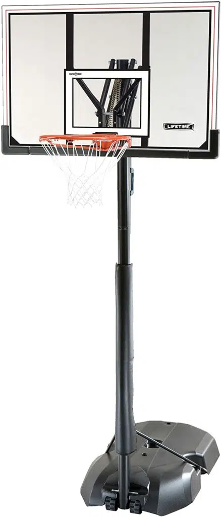 Highlights: High-density polyethylene and steel hoop, a 43″ x 28″ backboard, telescoping height adjustment, and a heavy-duty weight base.